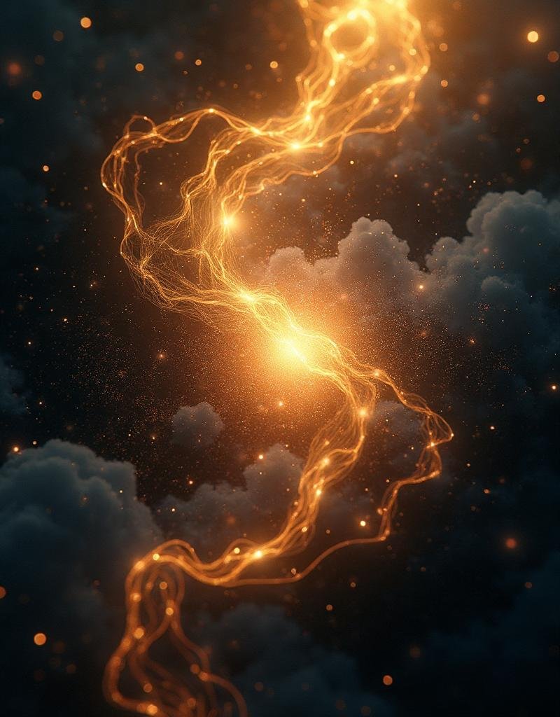 Les courbes dorées représentent le flux de la conscience, tandis que l’obscurité environnante symbolise l’infini des possibles.